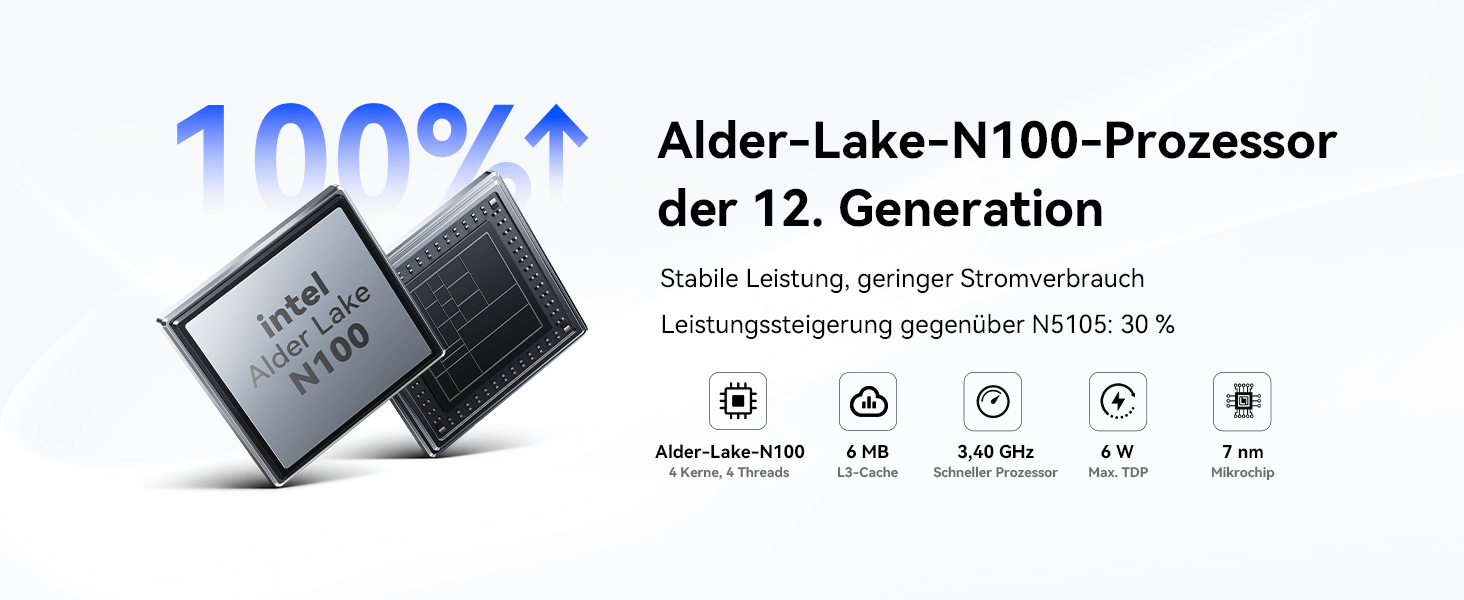 Auf Basis der Intel Alder-Lake-N-Architektur bietet sie bis zu 30 % mehr Effizienz und einen geringeren Stromverbrauch.