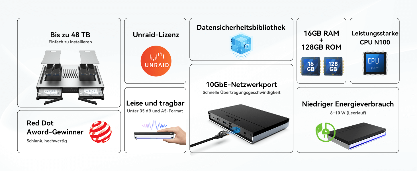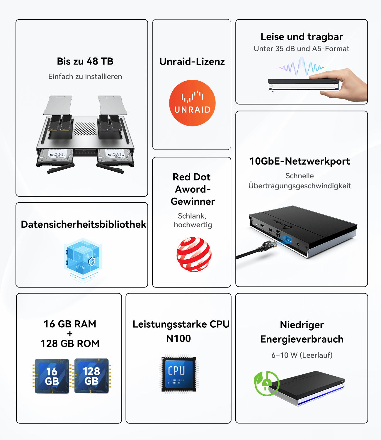 - Der kleine, tragbare SSD-NAS-Server ist mit einer Intel N100 CPU ausgestattet. 7-nm-Lithografie, 4 Kerne, 16 GB Arbeitsspeicher, 128 GB ROM, 2,00 GHz Basisfrequenz, 3,40 GHz Burst-Frequenz. Betrieben wird er durch ein Unraid-Starter-System.