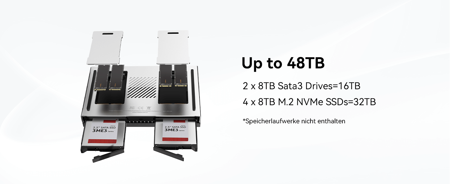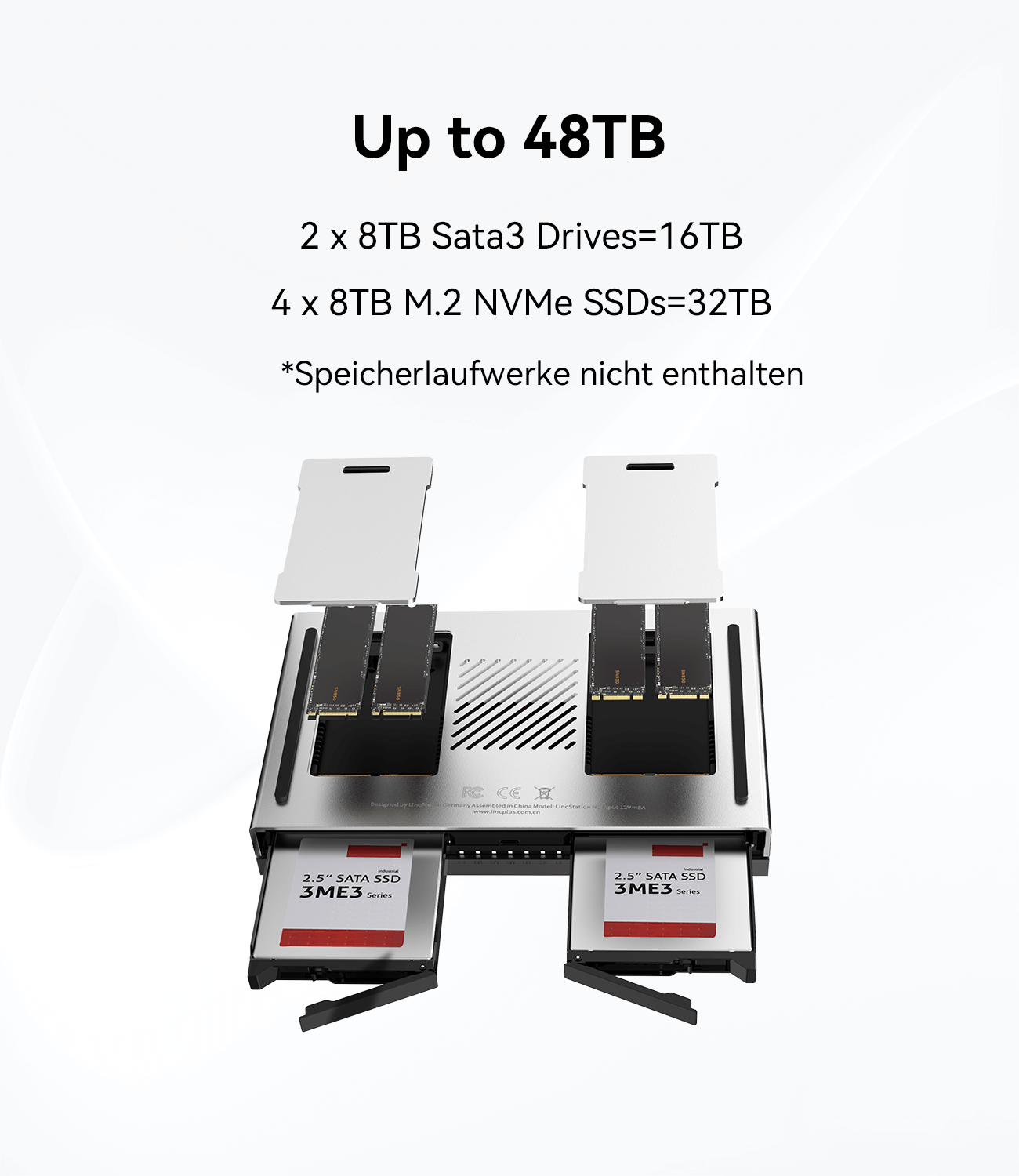 Kann 2,5-Zoll-HDDs oder SSDs mit SATA3-Schnittstelle oder NVMe-Festplatten der Spezifikation 2280 verwenden. Der Schacht hat eine Höhenbeschränkung von 9,5 mm, er kann SATA-HDDs unterstützen, die dünner als 9,5 mm sind.