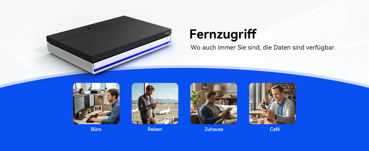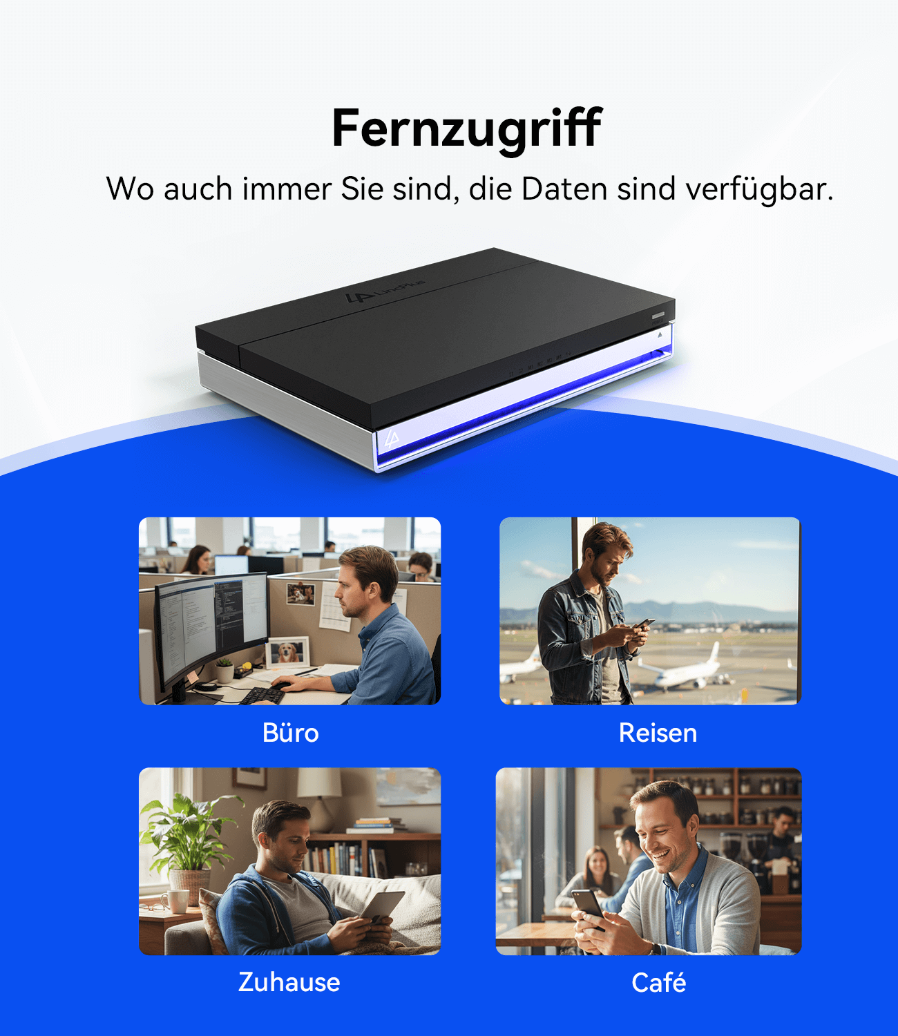 Greifen Sie mit diesem Netzwerkspeicher (NAS) unterwegs auf Ihre Dateien zu! Genießen Sie Freiheit und Sicherheit, indem Sie Ihre Daten mühelos von überall aus verwalten und teilen – dank Fernzugriff. Erleben Sie den Komfort eines mobilen Büros – Ihre Daten sind jederzeit verfügbar.