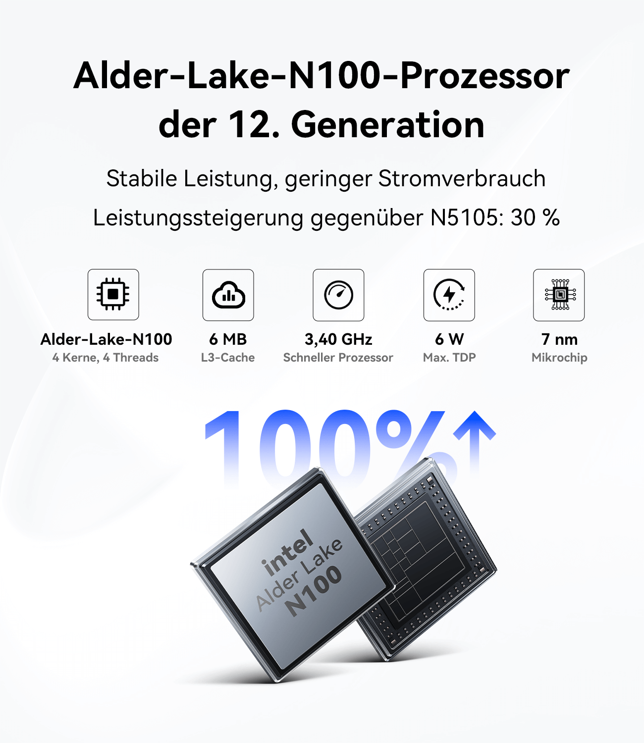 Auf Basis der Intel Alder-Lake-N-Architektur bietet sie bis zu 30 % mehr Effizienz und einen geringeren Stromverbrauch.