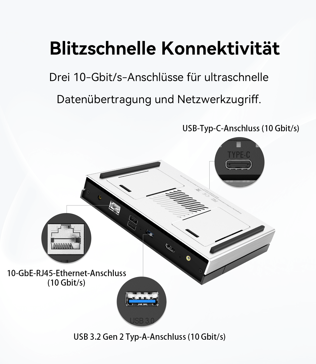 - Die umfangreiche Benutzeroberfläche bietet Nutzern mehr Möglichkeiten. Alles, was Sie brauchen, ist in diesem 6-Bay-NAS-Speicher integriert. 4-Bay PCIe M.2 2280 (M.2 NVME) SSD-Steckplatz, 2-Bay 2,5-Zoll-SATA-SSD-Steckplatz. 1 x 10G-Ethernet-Anschluss, 1 x USB-C-Anschluss, 1 x 3,5-Audio-Anschluss, 1 x HDMI 2.0, 1 x USB 3.2gen2, 2 x USB 2.0 Typ-A.